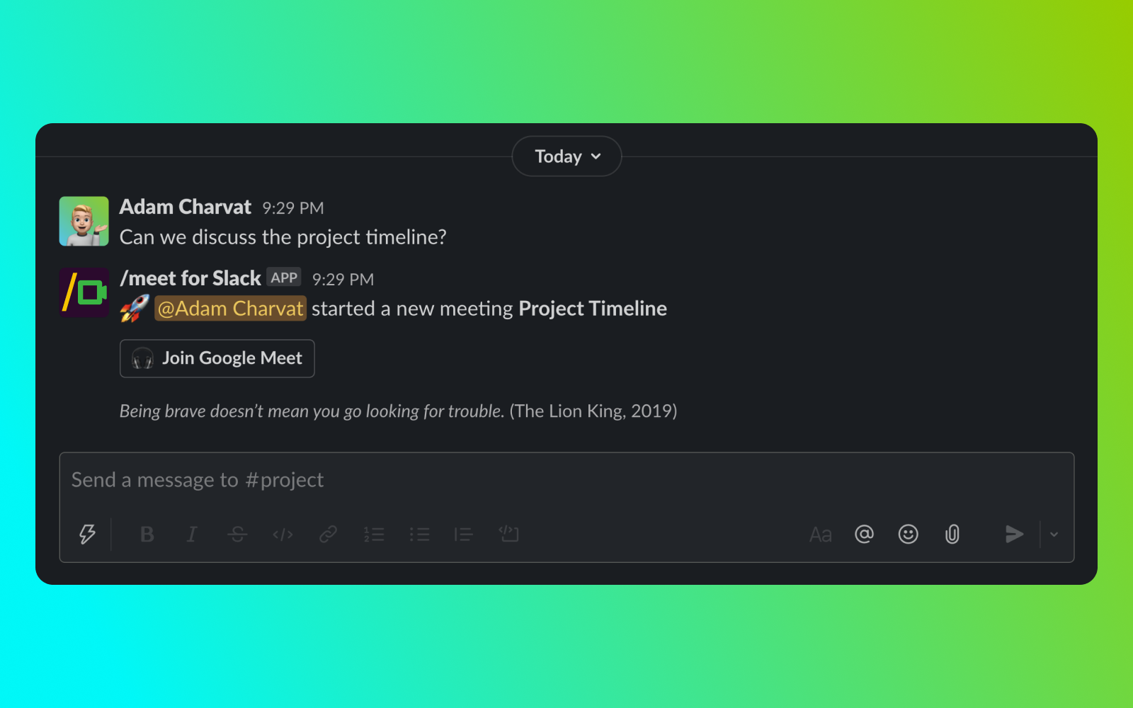 - Generate your Google Meet link in any channel, DM or group conversation just by typing /meet and optionally setting the meeting name.